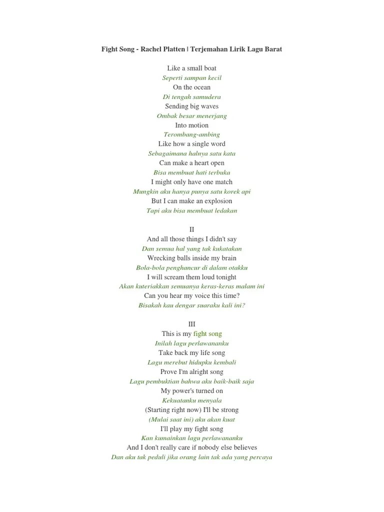 This is my fight song. Terima kasih sudah mampir di lirikulogi dan membaca lirik lagu fight song oleh rachel platten serta maknanya. Download lagu fight song rachel platten lyrics terjemahan this is my fight song dapat kamu download secara gratis di stafaband. Untuk menemukan lirik lagu rachel platten selain . Like a small boatseperti sampan kecilon the oceandi tengah samuderasending big wavesombak besar .